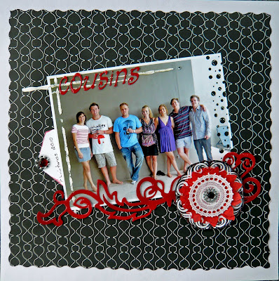 The red flourish has been cut using the Paper Lace Cricut cartridge and the flourish and title have been covered with Glossy Accents. The punch used on the RH side of the photo is an EK Success punch. Under the doily is a flower cut using the Tim Holtz Tattered flowers die. I have tucked a little journaling tag in behind the photo. All these products are available, or can be ordered, from Scottie Crafts.